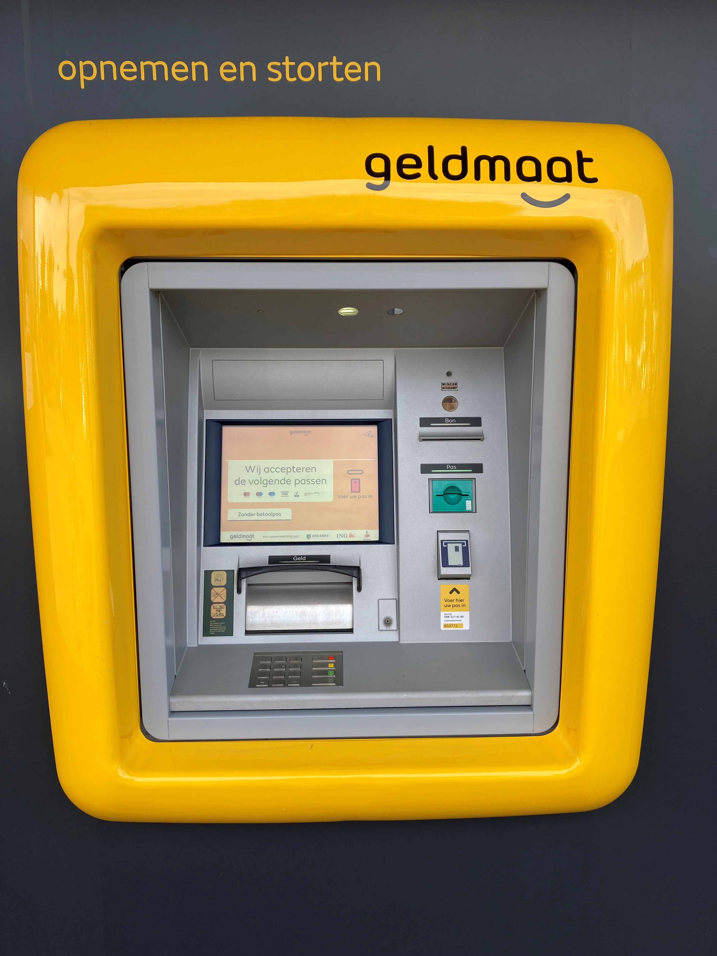 Samen zorgen we voor een goede beschikbaarheid en bereikbaarheid van geldautomaten in Nederland. 3 4 U wilt geld storten. Biljetten storten kan bij een stortautomaat met uw betaalpas en pincode. Geld storten aan een automaat.